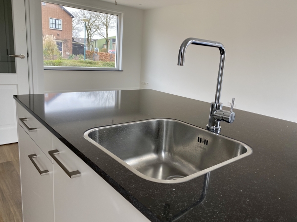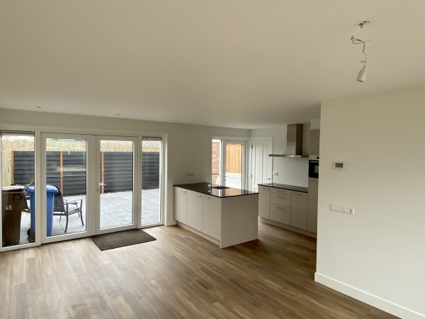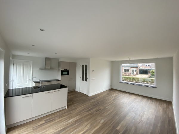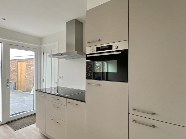 Entree, ruime hal, modern hangend toilet met fonteintje, ruimte voor wasmachine en droger, tevens opstelplaats CV-combiketel en trapopgang naar de eerste verdieping. De lichte woonkamer met open, moderne keuken is voorzien van een stijlvolle houtlook pvc-vloer (met vloerverwarming). De leemkleurige keuken beschikt over diverse inbouwapparatuur en een hardstenen aanrechtblad. Via de openslaande deuren loopt u zo de sfeervolle achtertuin in. Tevens is er een berging aanwezig, die ook bereikbaar is vanaf de oprit.